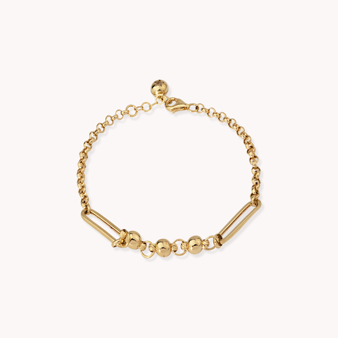 Crafted in 14 Karat gold and weighing 3.38 grams, this bracelet features a delicate balance of polished spheres and slender chain links, capturing a celestial elegance. Perfect for those who seek a refined yet distinctive accessory.