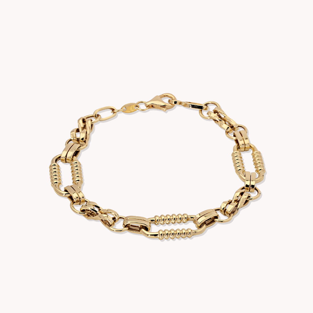 The Veritas Bracelet, crafted in 14K gold and weighing 5.05 grams, showcases a sophisticated design of interconnected links, each adorned with intricate details that add texture and elegance. A piece that embodies truth and luxury, it enhances any ensemble with a timeless appeal.