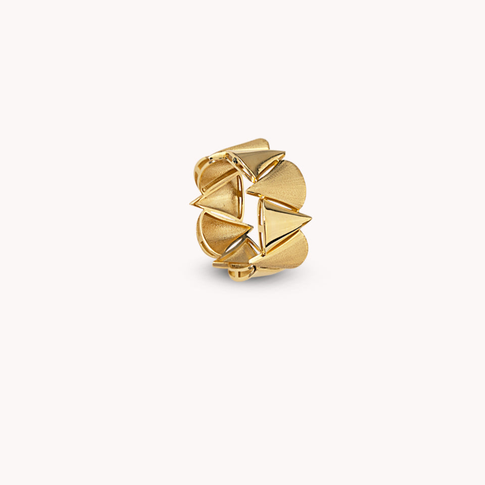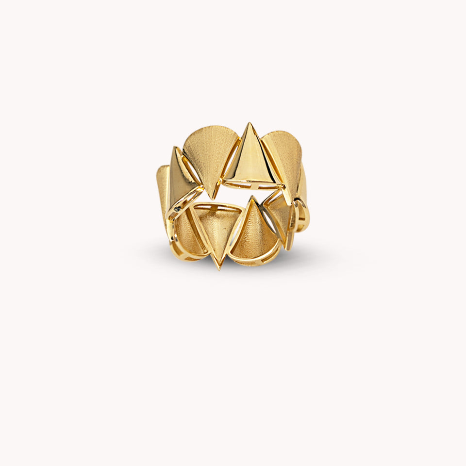 The Apex, crafted in 14 Karat gold and weighing 3.30g, is a bold and striking piece featuring sharp, geometric elements. Its distinctive design is perfect for making a statement with a touch of avant-garde elegance.