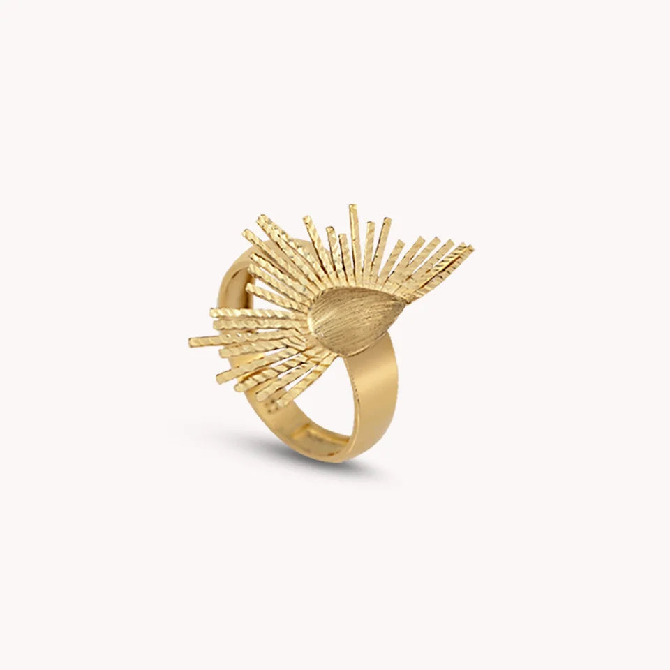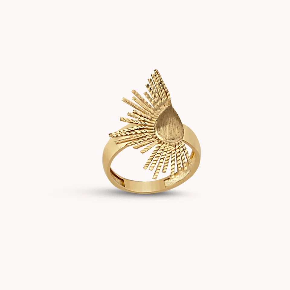 The Celestial Ring, crafted in 14 Karat gold and weighing 2.68g, features a radiant sunburst design that captures the essence of cosmic beauty, making it a bold and unique statement piece.