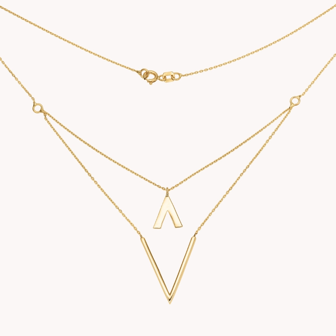 The Vertex Necklace, crafted in 14 Karat gold and weighing 2.32g, features a sleek and modern geometric design with layered "V" pendants. This minimalist piece is perfect for adding a bold, contemporary touch to any outfit.